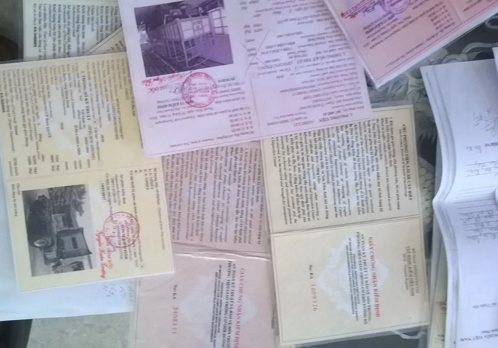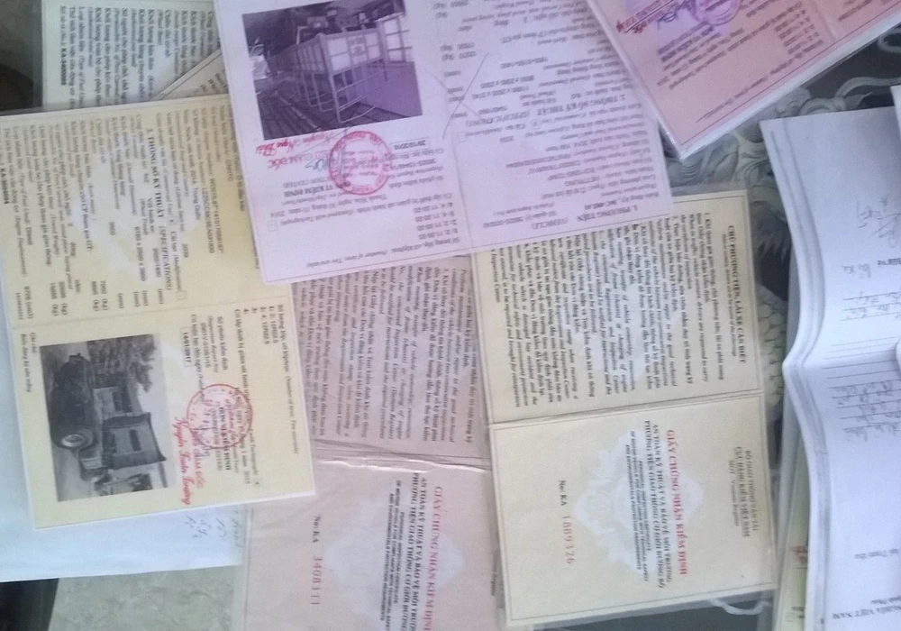 Hàng chục quyển sổ đăng kiểm giả bị phát hiện, tịch thu. Ảnh: TT