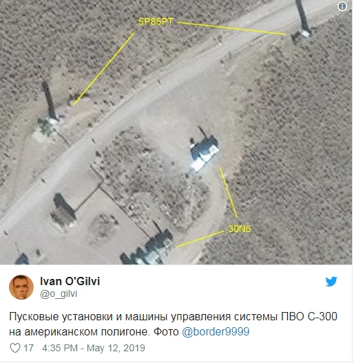 Hình ảnh vệ tinh đăng trên tài khoản Twitter của Ivan O'Gilvi, blogger chuyên tập trung phân tích các dữ liệu vệ tinh nhờ ứng dụng Google Earth, cho thấy hệ thống phòng thủ tên lửa đất đối không S-300PT do Liên Xô sản xuất xuất hiện tại một bãi thử không rõ địa điểm ở Mỹ, theo hãng tin Sputnik ngày 12-5.