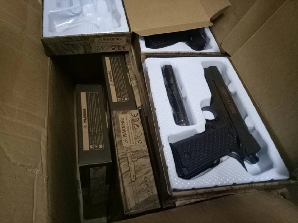 Tại thời điểm kiểm tra, cảnh sát phát hiện 108 khẩu súng ngắn nhãn hiệu Colt automatic caliber 6MM. Số súng này có trọng lượng, hình thức giống như súng thật, sử dụng đạn bi và có thể gây sát thương.