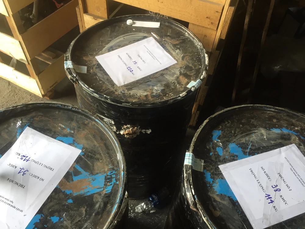 Mỗi thùng phuy chứa khoảng 100 kg ngà voi được niêm phong đem giám định.