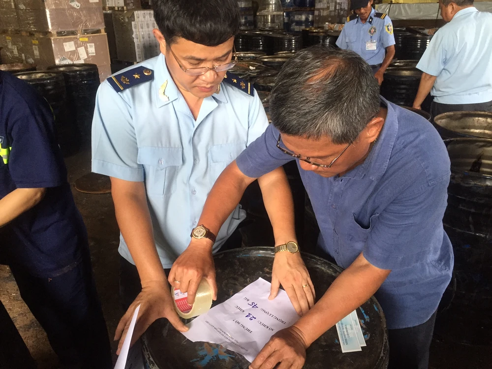 Ngày 6-9, Chi cục Hải quan cửa khẩu cảng Sài Gòn khu vực 1 phối hợp với Đội Kiểm soát hải quan, Cục Cảnh sát phòng, chống tội phạm về buôn lậu (C74), Phòng CSĐT tội phạm về quản lý kinh tế và chức vụ (PC46) Bộ đội biên phòng… tiến hành khám xét hai container hàng hóa với 100 thùng phuy chứa nhựa đường nhập từ Châu Phi.