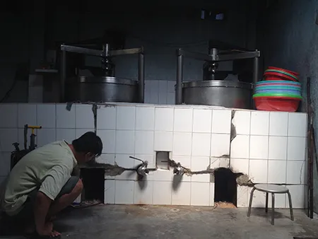 Đi tiếp vào bên chỗ sản xuất thật ớn lạnh khi ngay cạnh nhà vệ sinh là một bể nước, các máy xay ớt, các thùng phuy chứa ớt đang được ướp muối chờ xay nhuyễn, máy rót tương ớt. Hàng chục cái xô nhựa xếp chồng lên nhau ngay tại bếp… Tại đây còn có hàng trăm vỏ chai tương ớt đóng trong bao tải.
