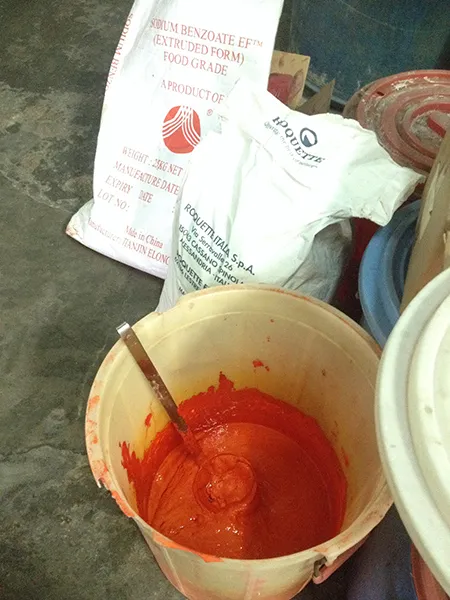 Đặc biệt khi nhìn thấy chất đặc sệt màu cam trong một cái xô, một cán bộ đoàn liên ngành cho biết chưa thể xác định đây là chất gì vì không có nhãn mác, chủ cơ cở chỉ cho biết là phụ gia thực phẩm mua từ chợ Kim Biên.