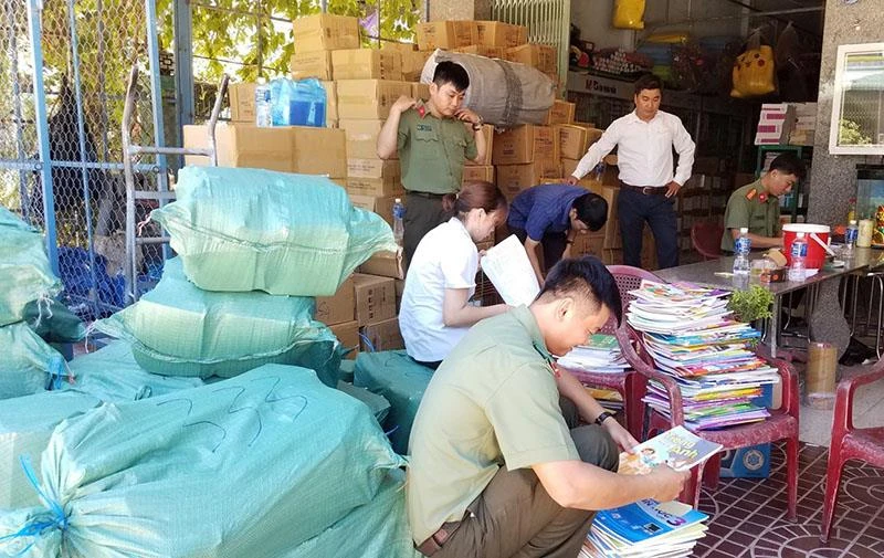 Lực lượng chức năng kiểm tra, tạm giữ sách giáo khoa nghi in lậu. Ảnh: CTV