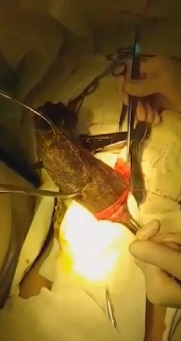 Bác sĩ lôi quả bóng tóc ra khỏi bụng cô gái. Ảnh cắt từ video
