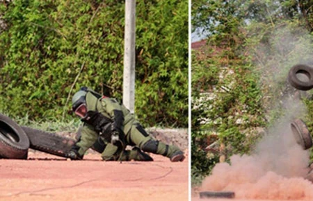 Cảnh sát xử lý bom mìn đã được điều động đến giải quyết (ảnh). Theo cảnh sát, hai quả lựu đạn được bắn từ cự ly gần nhưng chưa nổ.