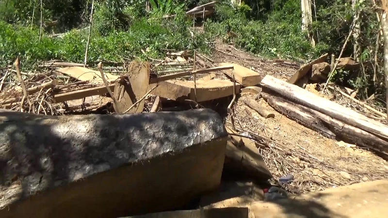 Hàng loạt cây rừng bị đốn hạ và cưa xẻ đưa ra khỏi rừng. Ảnh: H.TRƯỜNG
