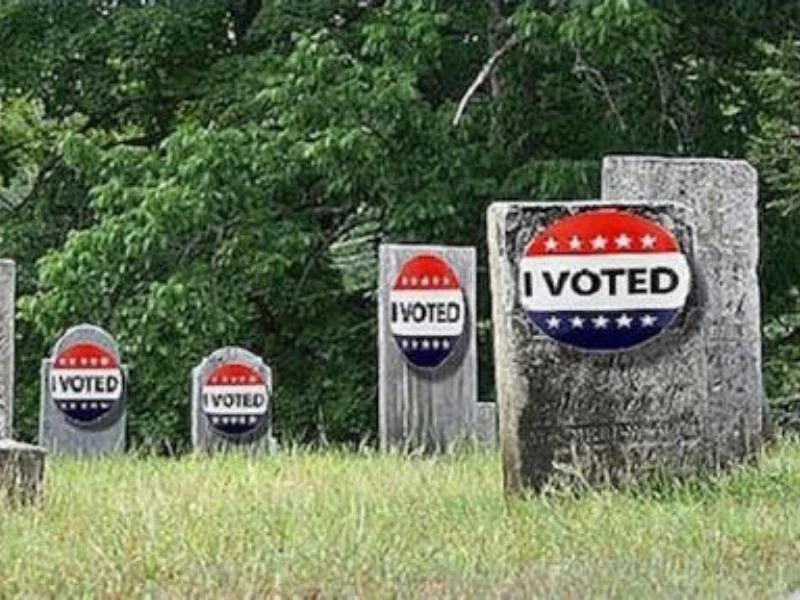 Việc điền vào lá phiếu tên của một người đã chết là hành vi gian lận và đã dẫn đến các vụ truy tố ở những nơi khác, gần đây nhất là ở Long Island, nơi một cử tri bị buộc tội giả mạo tên của người mẹ đã chết của mình trên một lá phiếu vắng mặt.