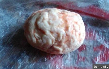 Thật bất ngờ, bên trong cục tròn này không phải là thịt hay mỡ mà là nhân màu vàng xanh chẳng khác gì lòng đỏ trứng vịt muối. Hơn nữa, mùi của nó cũng tựa như là mùi thuốc thảo dược.