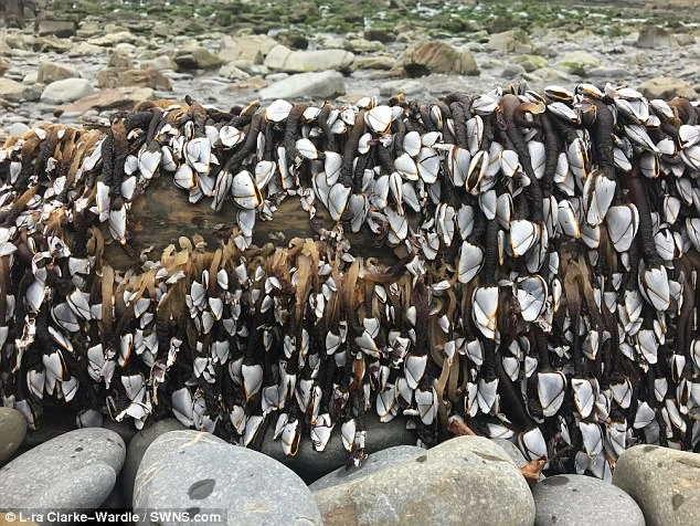Lara nhìn thấy những sinh vật kỳ lạ bám đầy một khúc gỗ mục trên bãi biển. Ảnh: LARA CLARKE-WARDLE