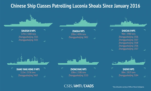 Theo dữ liệu, trong hai tháng đầu năm 2017, ba tàu Trung Quốc đã tuần tra quanh bãi cạn Luconia, một khu vực gồm đảo và các rạn san hô, cách Trung Quốc đại lục hơn 1.600 km và cách đảo Borneo của Malaysia 145 km.