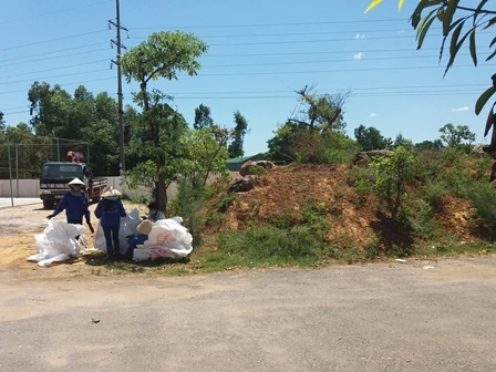 Công nhân chuẩn bị gom chất thải đưa về Công ty Xử lý rác thải Phú Hà chờ kiểm định. Ảnh: VIẾT LONG
