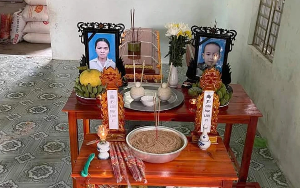Bàn thờ, di ảnh hai mẹ con chị Tình.