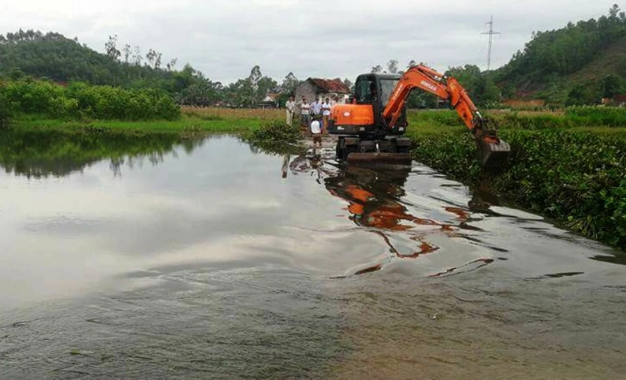Ngày 30-9, người dân huyện Diễn Châu (Nghệ An) mang dụng cụ và máy múc vớt lục bình trên sông Bàu Ganh (đoạn qua huyện Diễn Châu và huyện Yên Thành) để khai thông dòng chảy.