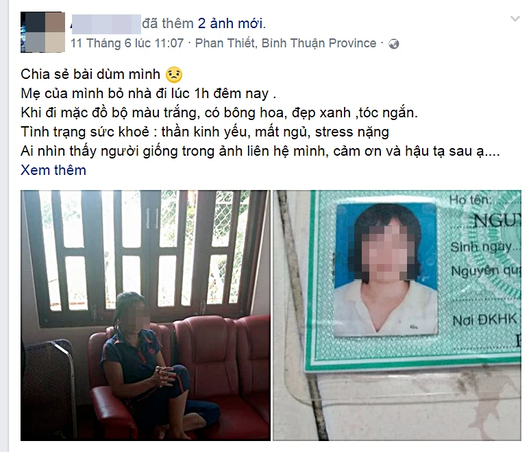 Được biết bà Thảo bị sang chấn tâm lý sau một cơn bệnh nặng và nhiều lần có ý định tự tử nhưng gia đình kịp thời phát hiện ngăn cản. Chiều 10-6 bà Thảo bất ngờ bỏ nhà đi gia đình tìm kiếm khắp nơi nhưng vô phương. Sau đó con trai của bà Thảo là A.Đ. đăng lên Facebook tìm mẹ và có hàng ngàn lượt chia sẻ.
