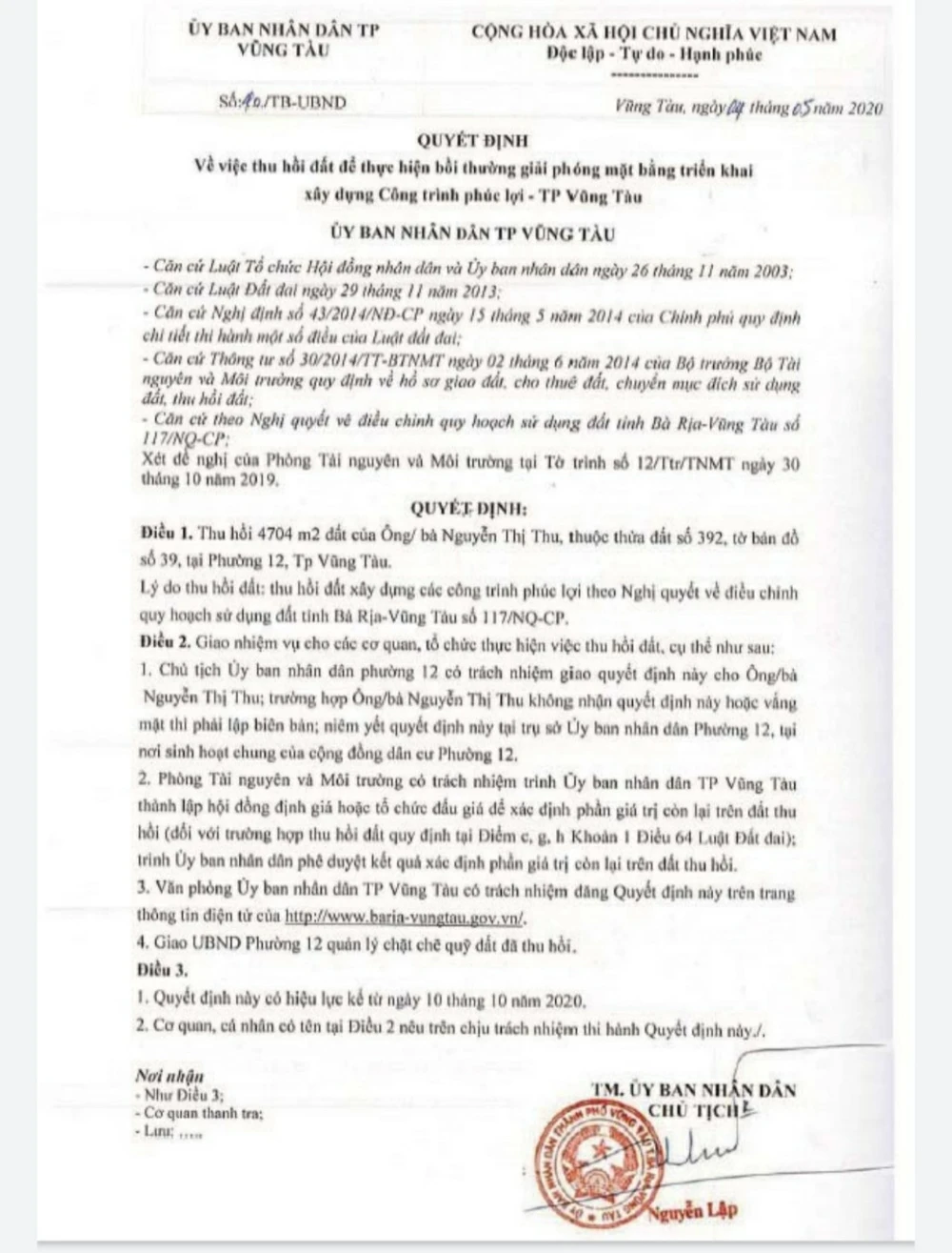 Theo văn bản có dấu hiệu giả mạo này thì TP Vũng Tàu thu hồi hơn 4700 m2 thuộc thửa đất số 392, tờ bản đồ số 39 (phường 12, TP Vũng Tàu) của một hộ gia đình cá nhân để thực hiện bồi thường giải phóng mặt bằng, triển khai xây dựng công trình phúc lợi TP Vũng Tàu.
