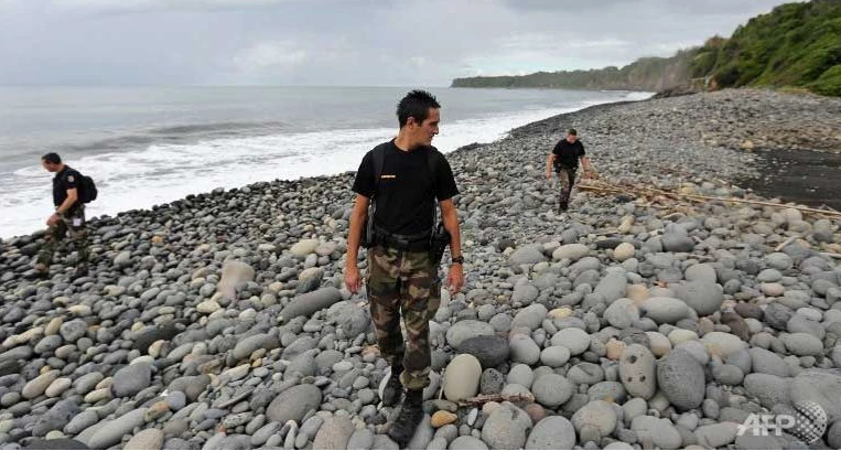 Cảnh sát Pháp tìm kiếm mãnh vỡ máy bay “xấu số" MH370 trên bờ biển đảo Reunion của Pháp nằm trên Ấn Độ Dương (ảnh: AFP)