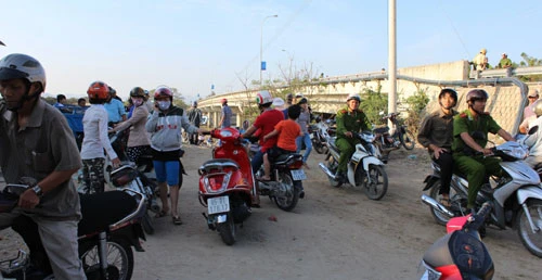 Lực lượng cảnh sát bảo vệ hiện trường để điều tra nguyên nhân nạn nhân tử vong tại chân cầu Đạo Long 1. Ảnh: M.TRÂN