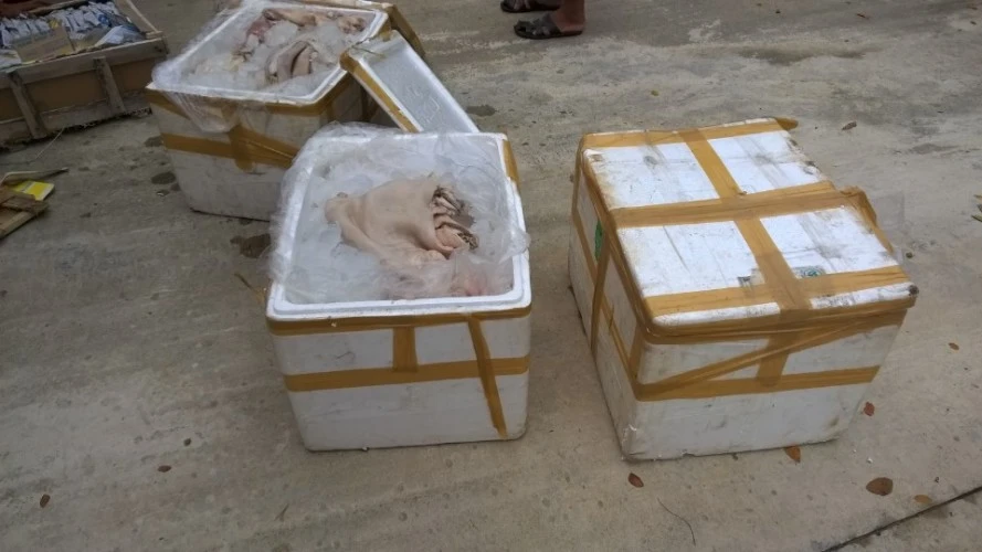 Chiều ngày 13-9, Đại úy Lê Phan Minh Mẫn - Phó trạm trưởng Trạm CSGT Thăng Bình (Phòng CSGT Công an tỉnh Quảng Nam), cho biết trong lúc làm nhiệm vụ tuần tra, kiểm soát trên tuyến QL1A (đoạn qua địa phận huyện Thăng Bình), đội đã tiến hành kiểm tra đối với xe khách chạy tuyến Bắc – Nam biển số 51B-113.41. Qua đó phát hiện dưới gầm xe có chứa ba thùng xốp, rỉ nước. Bên trong có chứa nhiều chân, da động vật đã bốc mùi. Tại thời điểm kiểm tra, tài xế xe khách tên Nguyễn Hữu Thanh (ngụ Q. Bình Thạnh, TP. HCM) không xuất trình các loại giấy tờ chứng minh nguồn gốc hợp pháp của số hàng nói trên.