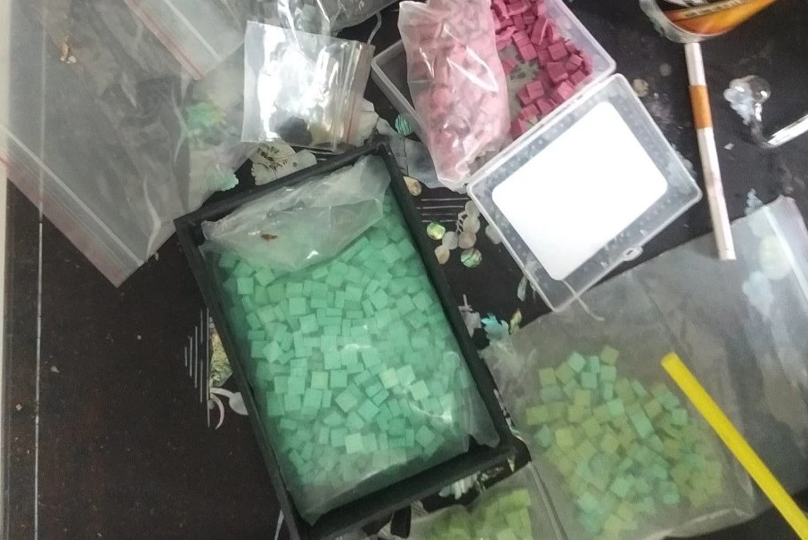 Qua khám xét, cơ quan điều tra thu giữ hơn 2.700 viên ma túy tổng hợp, 1 túi cỏ Mỹ, 5 túi ma túy đá, 1 máy sản xuất ma túy, nhiều dụng cụ sử dụng ma túy và nhiều hung khí dao kiếm...