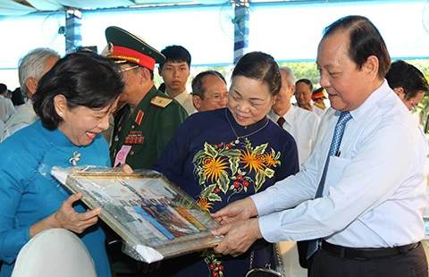Ông Lê Thanh Hải, Ủy viên Bộ Chính trị, Bí thư Thành ủy TP.HCM, thăm hỏi, tặng quà kỷ niệm các đại biểu tham dự lễ. Ảnh: TTXVN
