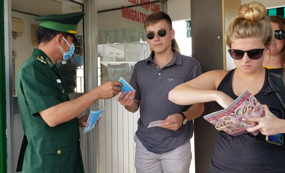 Lực lượng Biên phòng phát khẩu trang miễn phí cho sinh viên quốc tế khi lên bờ. Ảnh: TỰ SANG