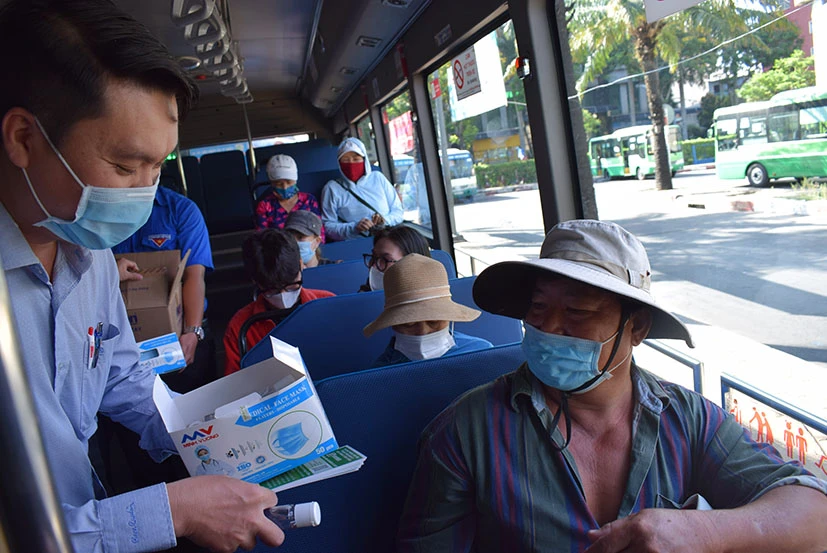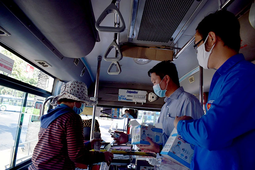 Đại diện Trung tâm lên tận xe buýt trao tận tay cho hành khách. Ảnh: NGUYỄN TRÀ.