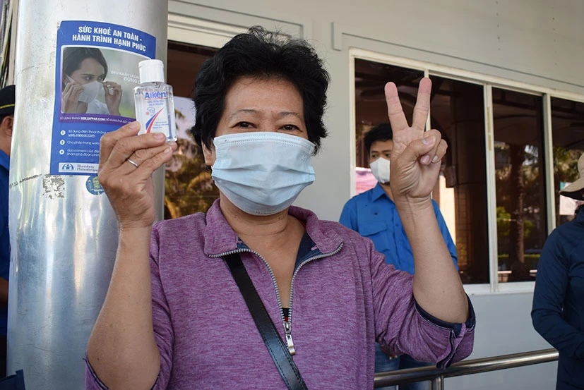 Cô Hồ Ngọc Hoa nhận khẩu trang trước khi về quận 7. Ảnh: NGUYỄN TRÀ.