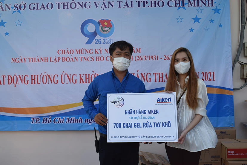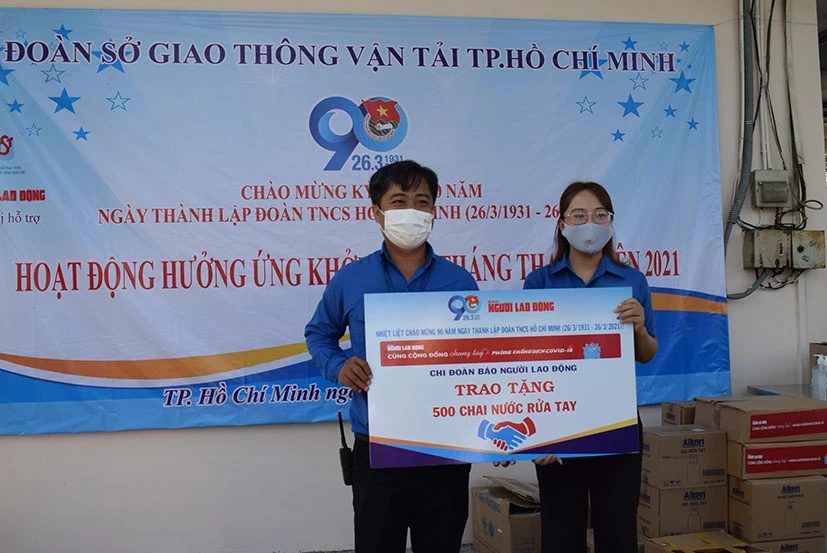Chi đoàn Báo Người lao động tặng 500 chai nước rửa tay. Ảnh: NGUYỄN TRÀ.