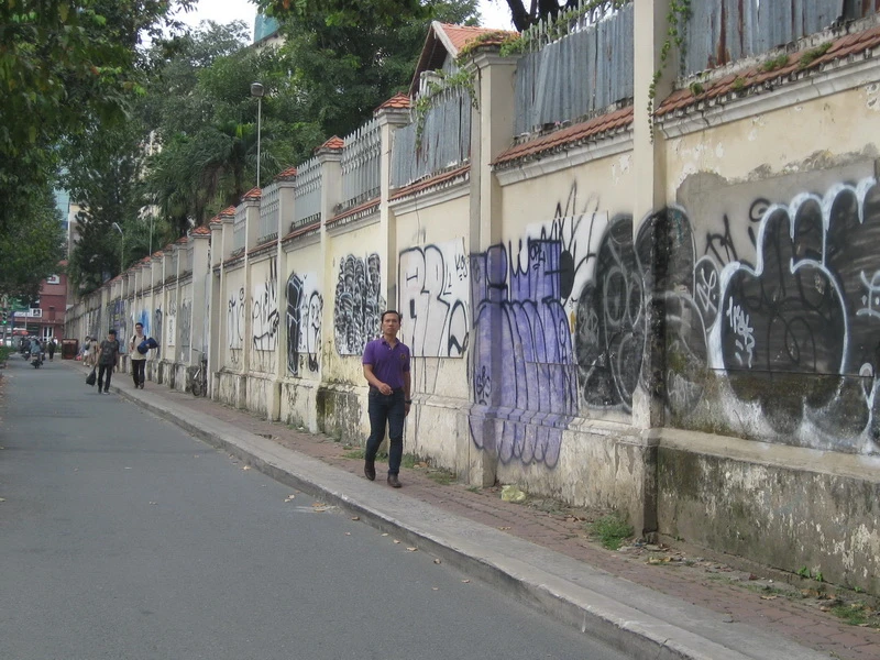 Đây là một trong những hình ảnh thường thấy khi chuyện vẽ bậy lên tường xuất hiện ngày càng nhiều trên các vỉa hè TP.HCM, gây mất mỹ quan đô thị (ảnh).