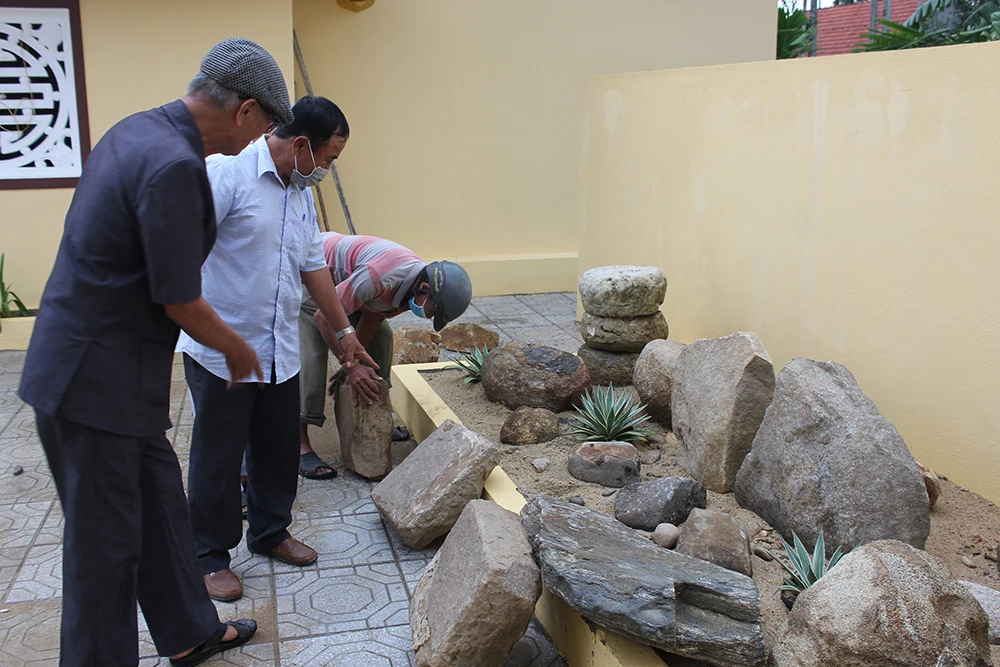 Nhiều hiện vật là những trụ cột bằng đá vôi, đá dạng hình vuông được dân làng Điền Trang bảo tồn sau khi phát hiện yoni. Ảnh: VÕ QUÝ