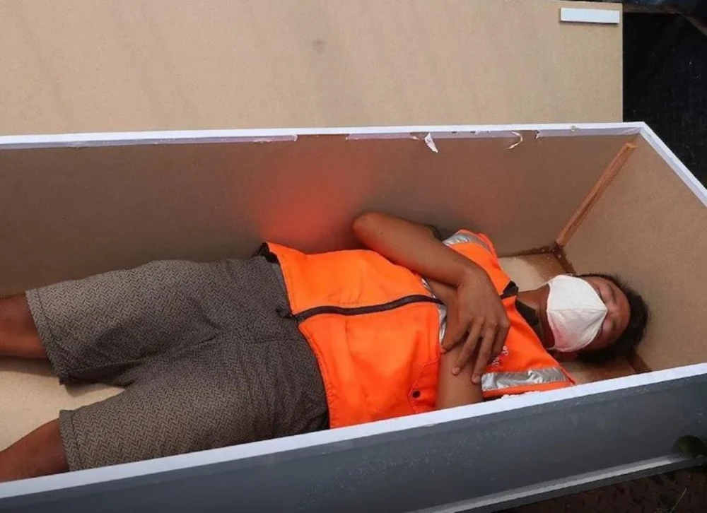 Theo quy định mới được đưa ra thử nghiệm, những người bị bắt quả tang không đeo khẩu trang sẽ phải lựa chọn nằm bên trong quan tài, nộp phạt hoặc làm công việc phục vụ cộng đồng, theo báo cáo của đài truyền hình Liputan 6.