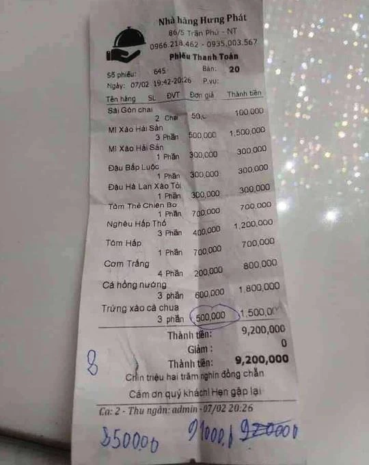 Trước đó, như Pháp Luật TP.HCM đã phản ánh, trên mạng xã hội Facebook chia sẻ rất nhiều một phiếu thanh toán ghi tên nhà hàng Hưng Phát in vào tối 7-2 (tức mùng Ba Tết). Trong đó, nhiều món ăn được tính tiền với giá cao không tưởng. Chẳng hạn, món trứng xào cà chua có giá đến 500.000 đồng/phần, mì xào hải sản 500.000 đồng/phần, đậu bắp luộc 300.000 đồng/phần, đậu hà lan xào tỏi 300.000 đồng/phần, cơm trắng 200.000 đồng/phần… Đoàn khách ăn được cho là đến từ Malaysia do một công ty lữ hành đưa đến. Hầu hết các ý kiến đều bày tỏ sự bất bình, bức xúc với mức giá quá cao như trên.