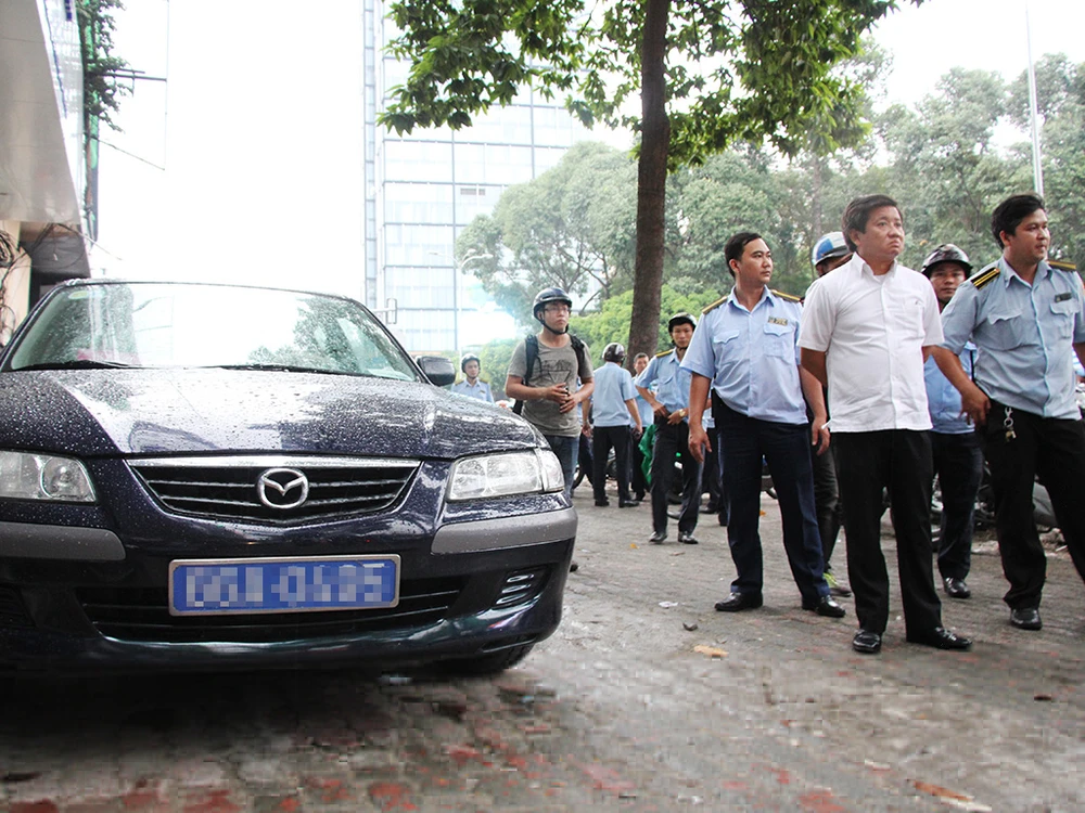 Trên đường Nguyễn Thái Học (phường Phạm Ngũ Lão, quận 1), đoàn liên ngành phát hiện xe ô tô thuộc đăng ký của Sở Kế hoạch Đầu tư tỉnh Đồng Tháp đậu trên vỉa hè nên lập biên bản xử phạt 700.000 đồng.