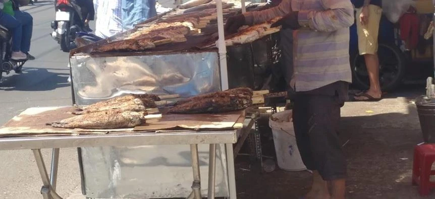 Một cửa hàng bán cá nướng ngay trên vỉa hè nhưng không có dụng cụ che đậy, vì vậy khói bụi của xe qua lại dễ dàng bám vào. Ảnh: CN