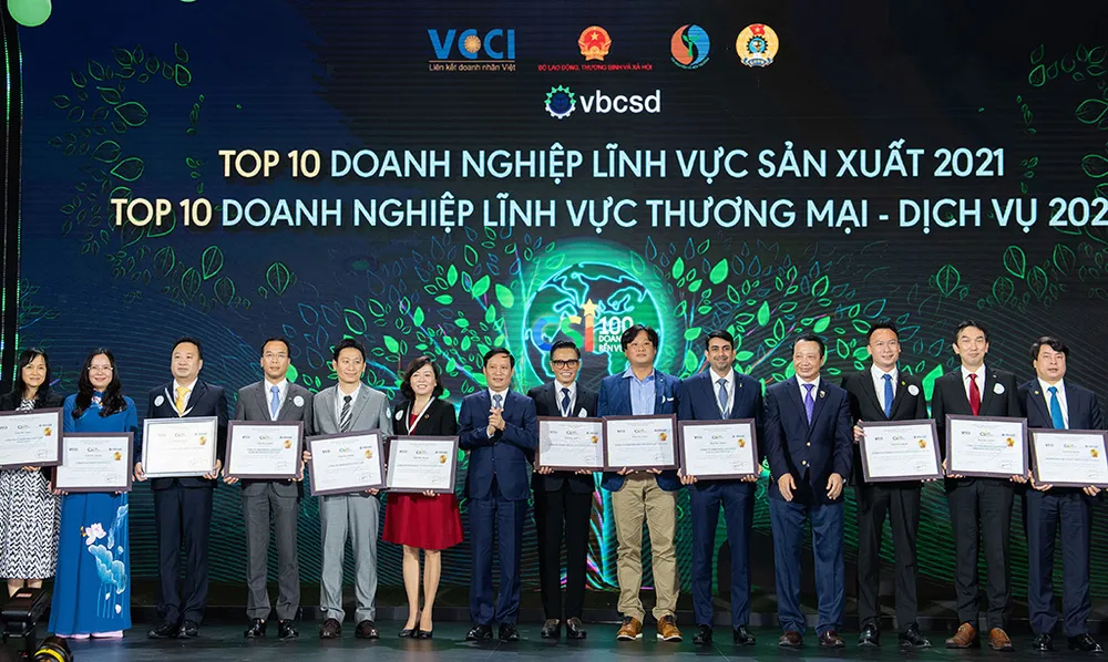 Đại diện FCV (đeo kiếng, ở giữa hình) nhận giải tại lễ vinh danh Top 10 doanh nghiệp phát triển bền vững từ những đóng góp cho cộng đồng
