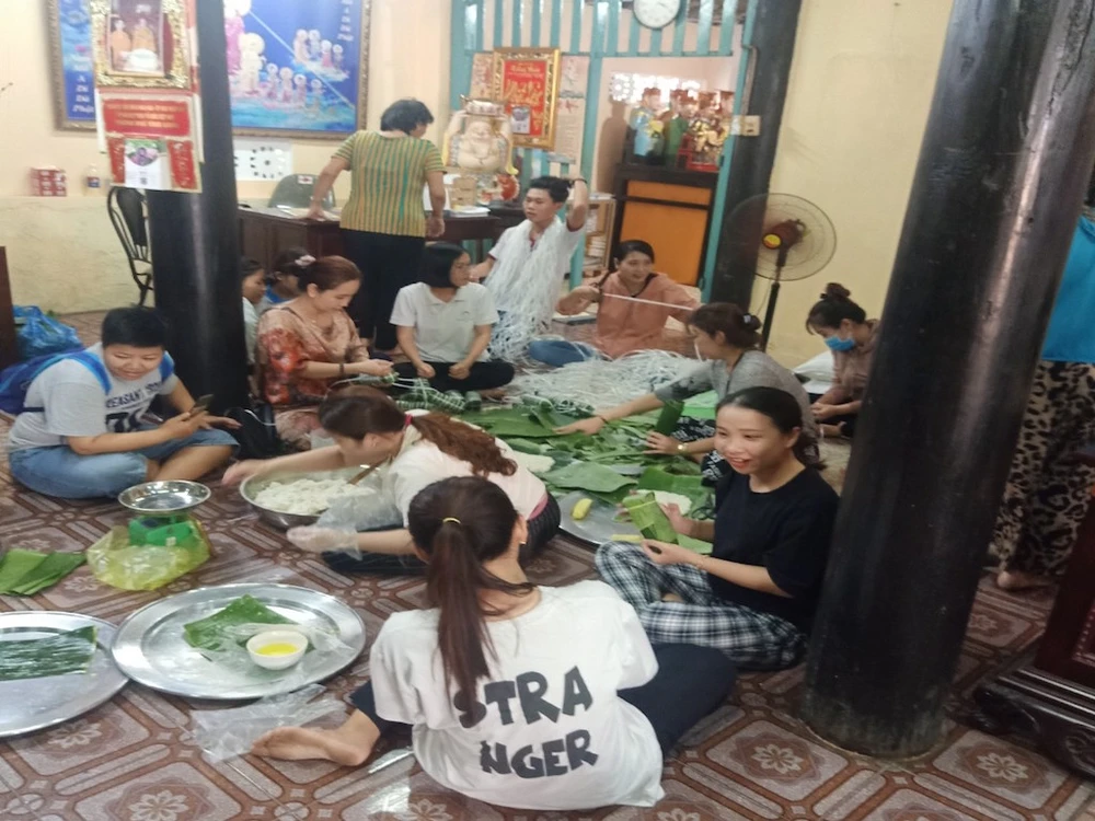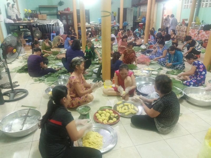 Ngày từ rất sớm, các phật tử đã có mặt ở chùa, mỗi người mỗi việc xào nếp, vò nhân, gói bánh… vô cùng nhộn nhịp. Chị Nguyễn Thị Mỹ Linh (26 tuổi) là nhân viên văn phòng khi hay tin chùa kêu gọi gói bánh tét hỗ trợ bà con miền Trung, chị đã lập tức xin nghỉ làm ba ngày để đến phụ giúp.