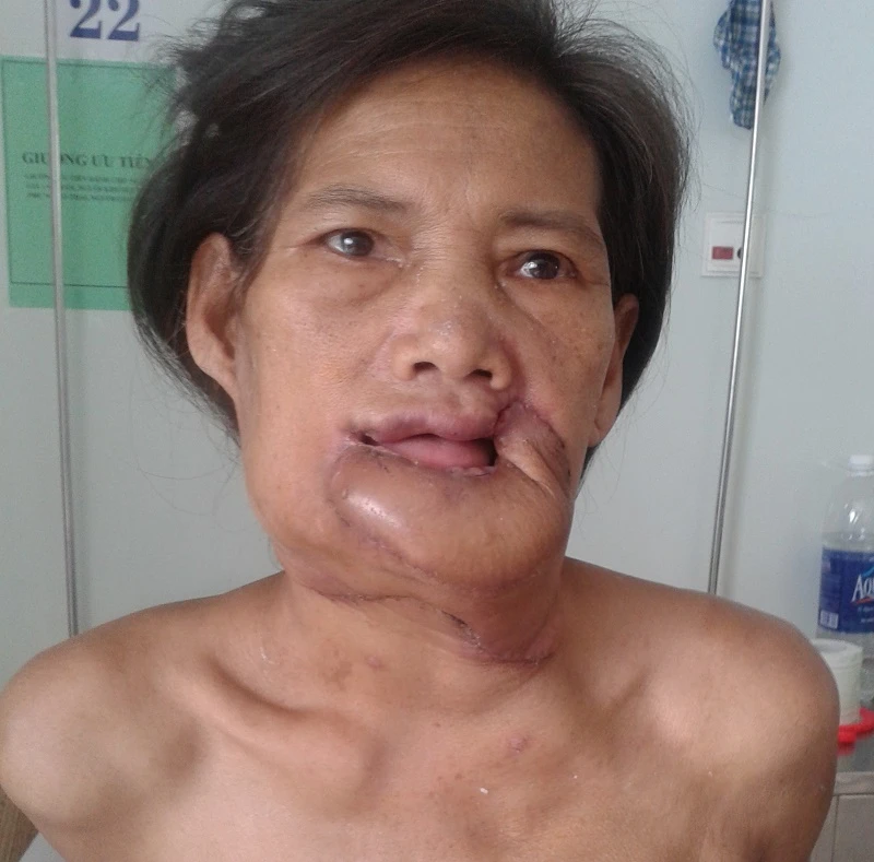 Theo người nhà, bệnh nhân H. phát hiện bướu môi dưới cách đây bốn năm nhưng tự mua thuốc Nam uống. Tuy nhiên, bướu không giảm mà ngày càng lớn thêm, đến khi không ăn uống được mới đi khám. Qua thăm khám, các bác sĩ khoa Ngoại 2 (BV Ung bướu Đà Nẵng) chẩn đoán chị H. bị ung thư môi dưới lan rộng, giai đoạn 4a, cần tiến hành phẫu thuật.