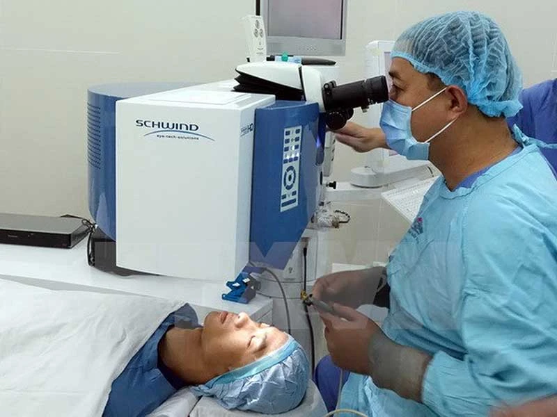 Bác sĩ BV Mắt TP.HCM thực hiện ca phẫu thuật khúc xạ mắt bằng công nghệ SmartSurfACE cho bệnh nhân. Ảnh: TTXVN