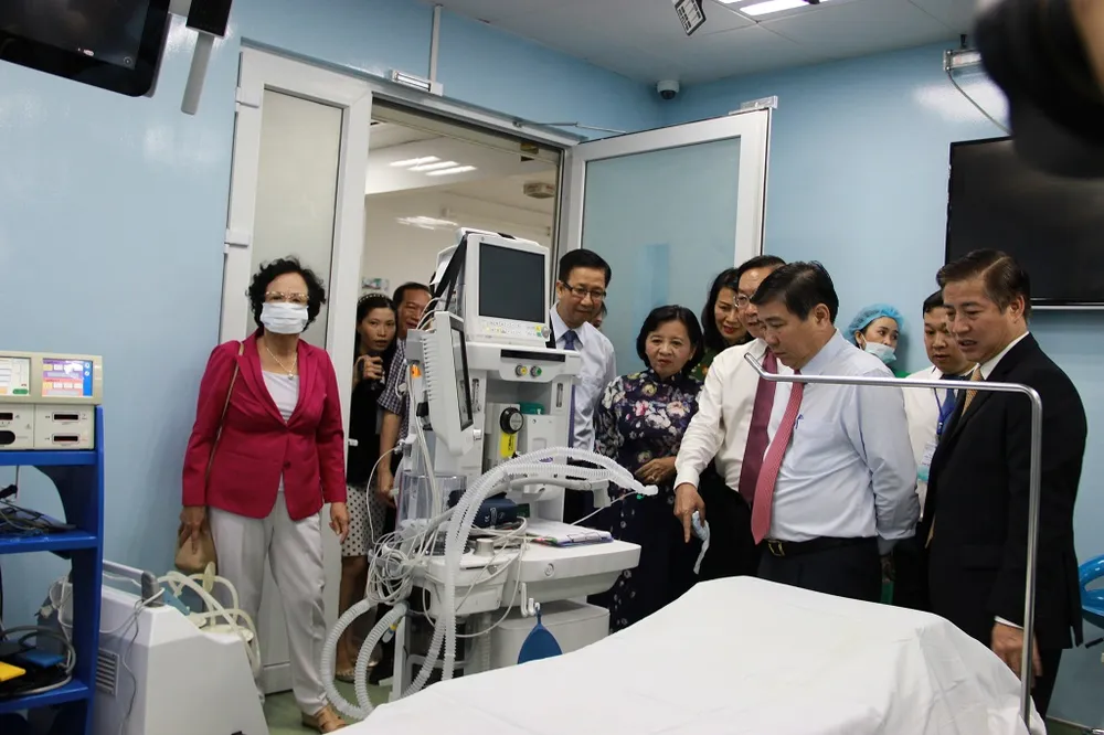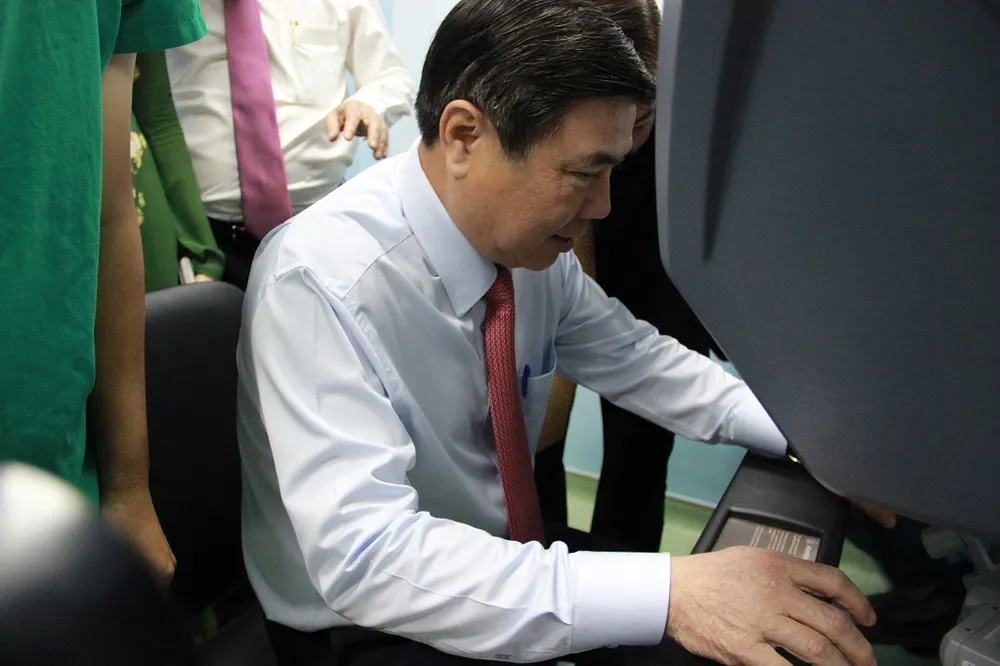 Lãnh đạo TP.HCM cùng Bộ Y tế tham quan phòng phẫu thuật robot. Ảnh: HP