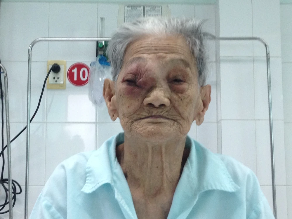Theo BS Hớn, cách đây 6-7 năm, bà cụ bị sưng hốc mắt phải và ngày càng lớn, đẩy mắt lồi ra ngoài. Bà được bệnh viện địa phương chẩn đoán u nhầy bạch mạch nhưng không phẫu thuật vì nghĩ bà tuổi cao. Gần đây u lớn quá mức nên bà được gia đình đưa đến BV Tai Mũi Họng TP.HCM điều trị vào ngày 22-7.