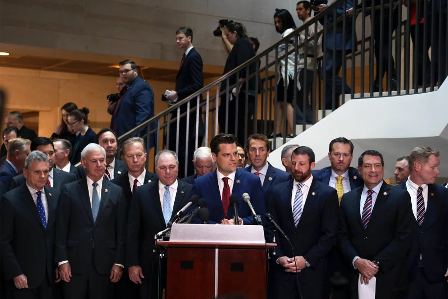 Các hạ nghị sĩ Cộng hòa tổ chức họp báo, yêu cầu minh bạch trong điều tra luận tội Tổng thống Trump, trước khi xông vào SCIF. Ảnh: GETTY IMAGES