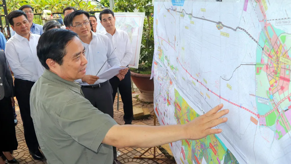 Thủ tướng Phạm Minh Chính cùng đoàn công tác của Trung ương đến khảo sát thực địa nút giao IC4, một trong chín nút giao thuộc dự án cao tốc Bắc - Nam phía Đông, đoạn Cần Thơ - Cà Mau. Ảnh: CHÂU ANH |