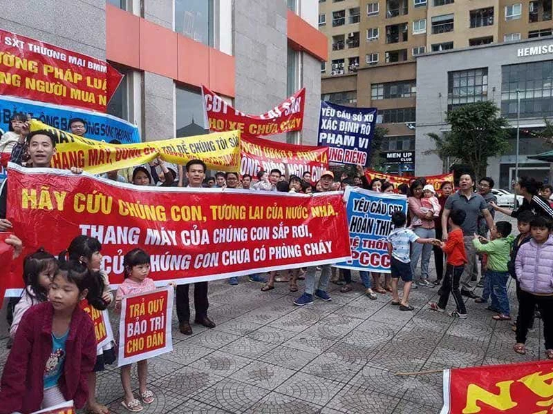 Cư dân chung cư BMM mang băng rôn xuống sảnh biểu tình trong ngày 15-4. Ảnh: BÁ CƯỜNG