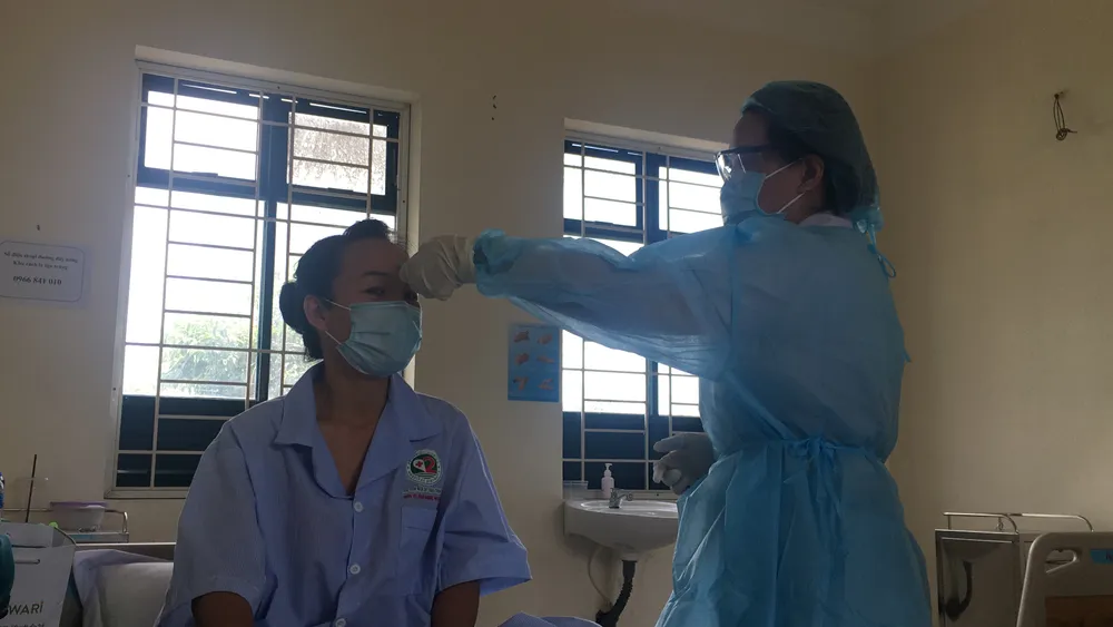 Nhân viên y tế khu cách ly quận 2 đang kiểm tra thân nhiệt cho một người về từ Hàn Quốc được cách ly. Ảnh: HL