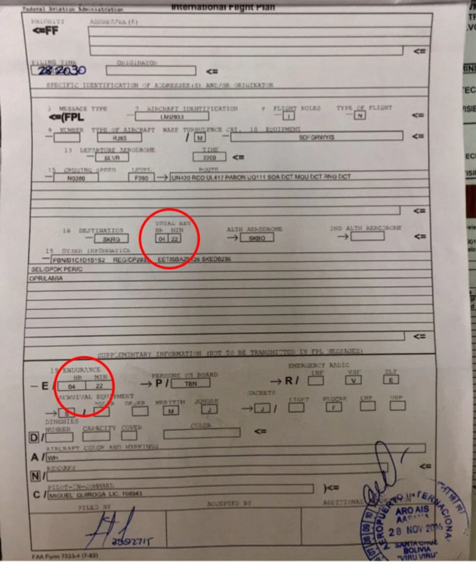 Thế nhưng hồ sơ chuyến bay nộp cho cơ quan chức năng Colombia lại ghi địa điểm khởi hành của chiếc LAMIA là Cobija, gần Medellin hơn Santa Cruz tới 800 km - với lượng xăng thừa sức bay thêm 90 phút nữa.