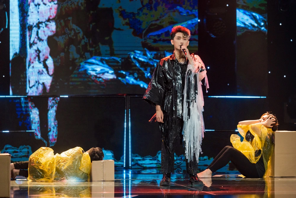 Anh gây ấn tượng với phục trang được thiết kế từ bao ni lông độc đáo, phần dàn dựng sân khấu khác biệt cũng là một điểm cộng lớn cho tiết mục này.