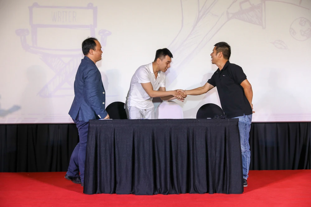 Thí sinh Nguyễn Tấn Nhật và nhà sản xuất ký thỏa thuận hợp tác phát triển kịch bản phim cùng thí sinh.