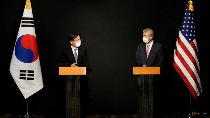 Đặc phái viên Mỹ về Triều Tiên Sung Kim và ông Noh Kyu-duk, Đại diện Hàn Quốc về các vấn đề hòa bình và an ninh trên Bán đảo Triều Tiên, tham dự một cuộc họp báo tại một khách sạn ở Seoul, ngày 24-10. Ảnh: REUTERS