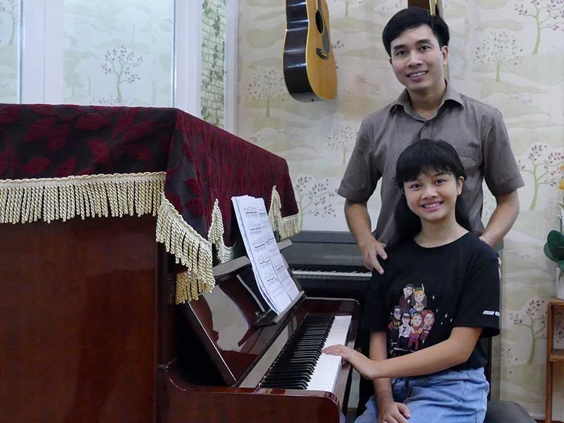 Anh Nguyễn Ngọc Anh cùng bé Lan Anh bên cây đàn piano đã gắn bó với bé suốt bảy năm qua. Ảnh: NQ